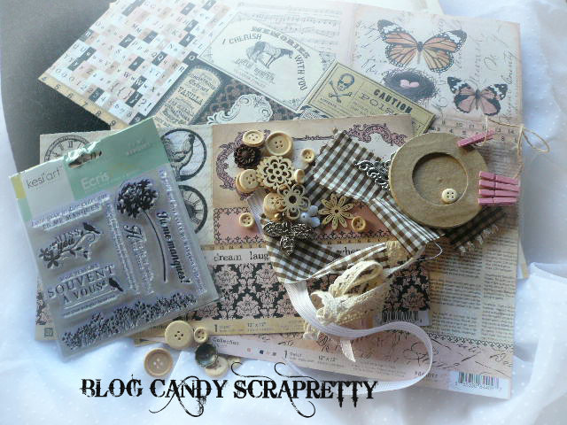 Ce blog candy se compose des très beaux papiers Prima, de la feutrine noire, les très beaux tampons Kési art et pleins d'embellissements ......
